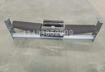 雙中輥調(diào)偏托輥組回轉(zhuǎn)軸焊在下橫梁上,回轉(zhuǎn)總成包括組合軸承、回轉(zhuǎn)軸套)安裝在下橫梁上,回轉(zhuǎn)總成外圍設(shè)計了可擺動的中托輥橫梁以回轉(zhuǎn)軸為中心,在運行膠帶前、后中托輥橫梁各設(shè)置一個中托輥形成以回轉(zhuǎn)軸為中心的平衡支撐。側(cè)托輥采用加大軸承和軸徑設(shè)計,用側(cè)托輥軸代替常規(guī)的側(cè)托輥橫梁功能。側(cè)托輥可拆卸的安裝在兩中輥中間。側(cè)托輥為錐形輥設(shè)計,錐形輥采用鑄橡膠結(jié)構(gòu),其在膠帶跑偏時能產(chǎn)生較大的回向阻尼效果,從而使膠帶居中平穩(wěn)運行。
